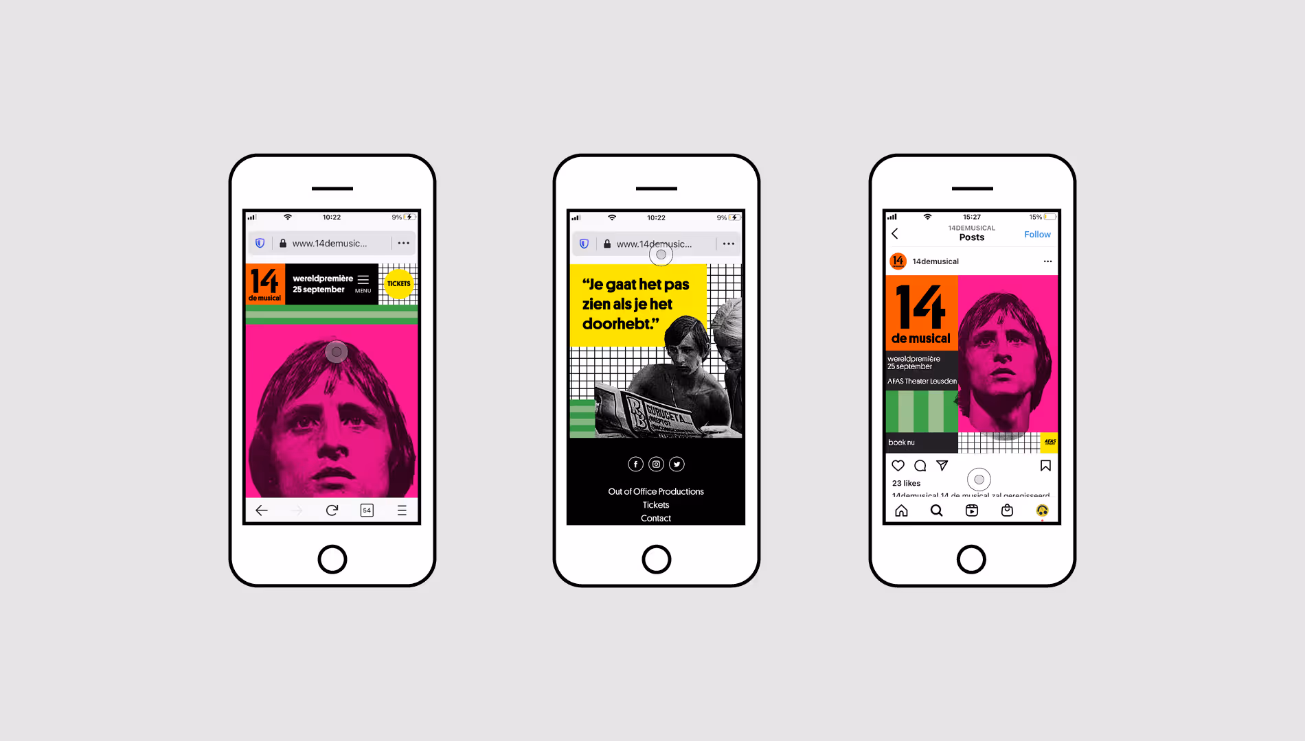 14 the musical shows how Johan Cruijff evolves into a superstar. Stemming from the period the musical is situated in, we used pop art as inspiration and created a building blocks-based concept. These building blocks allow each creation to be as distinguishable as the Great Cruijff himself.