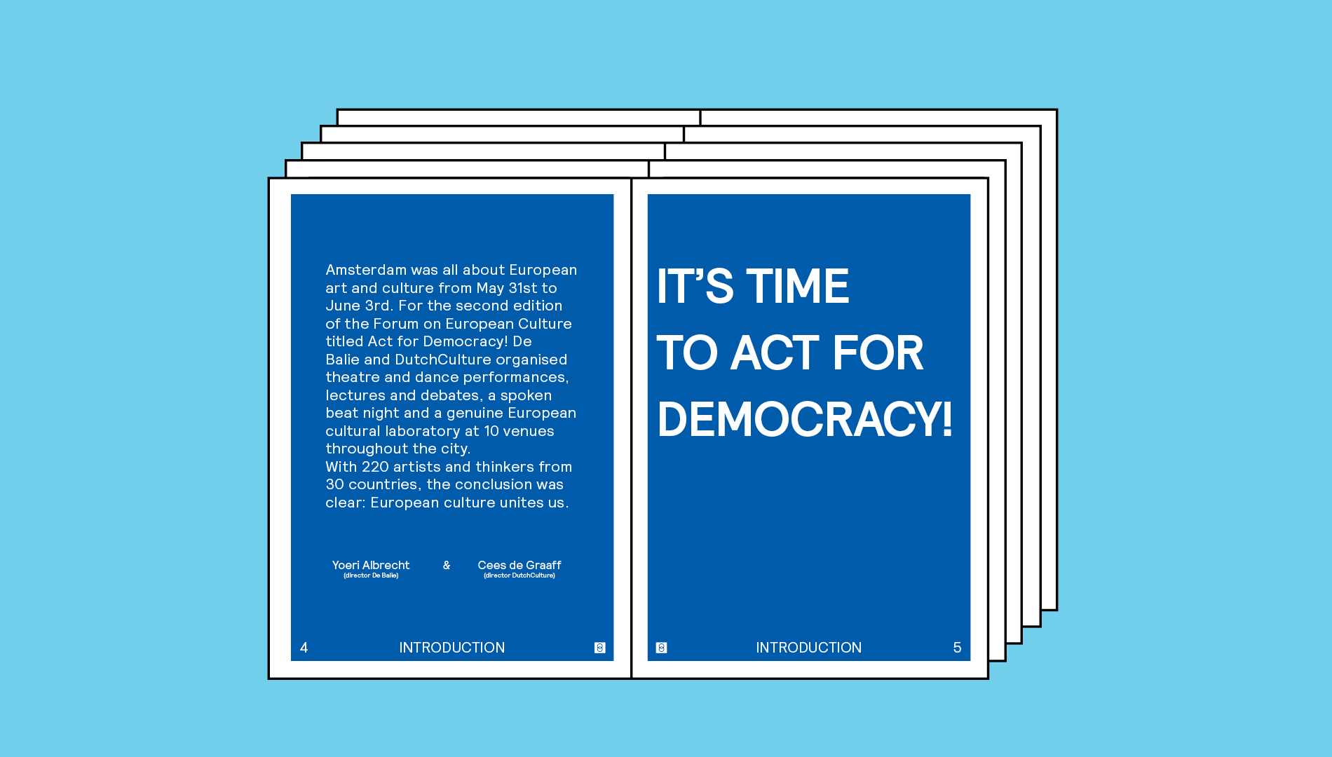 Act for Democracy is the second edition of Forum on European Culture, a biennial forum on the strength, impact and value of art and culture for European democracy organised by De Balie and DutchCulture. As with the first edition, we provided the visual identity. We felt that we had to express ourselves even more: against populism, more guts, more in your face. Time for action! Act for democracy.
