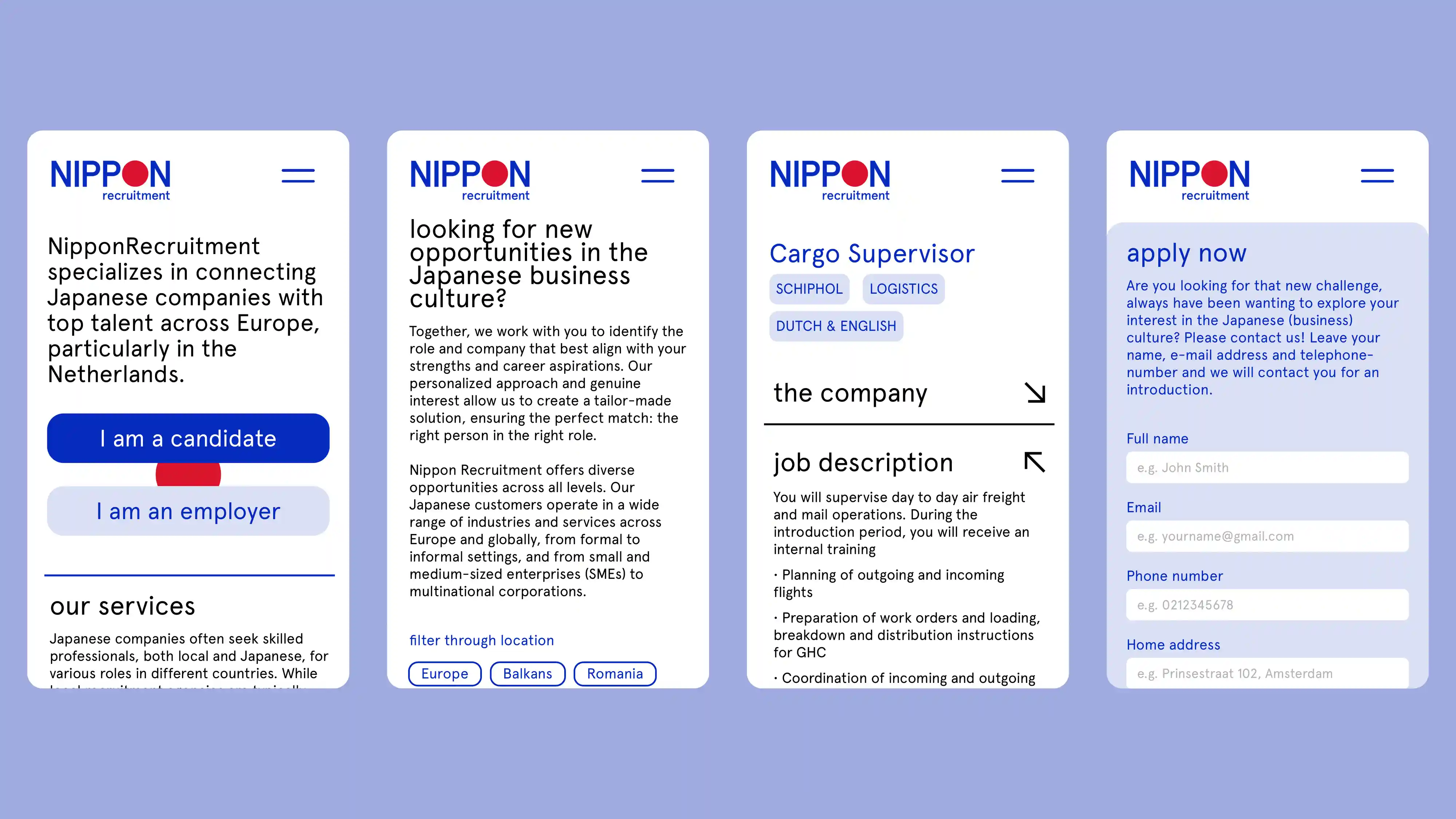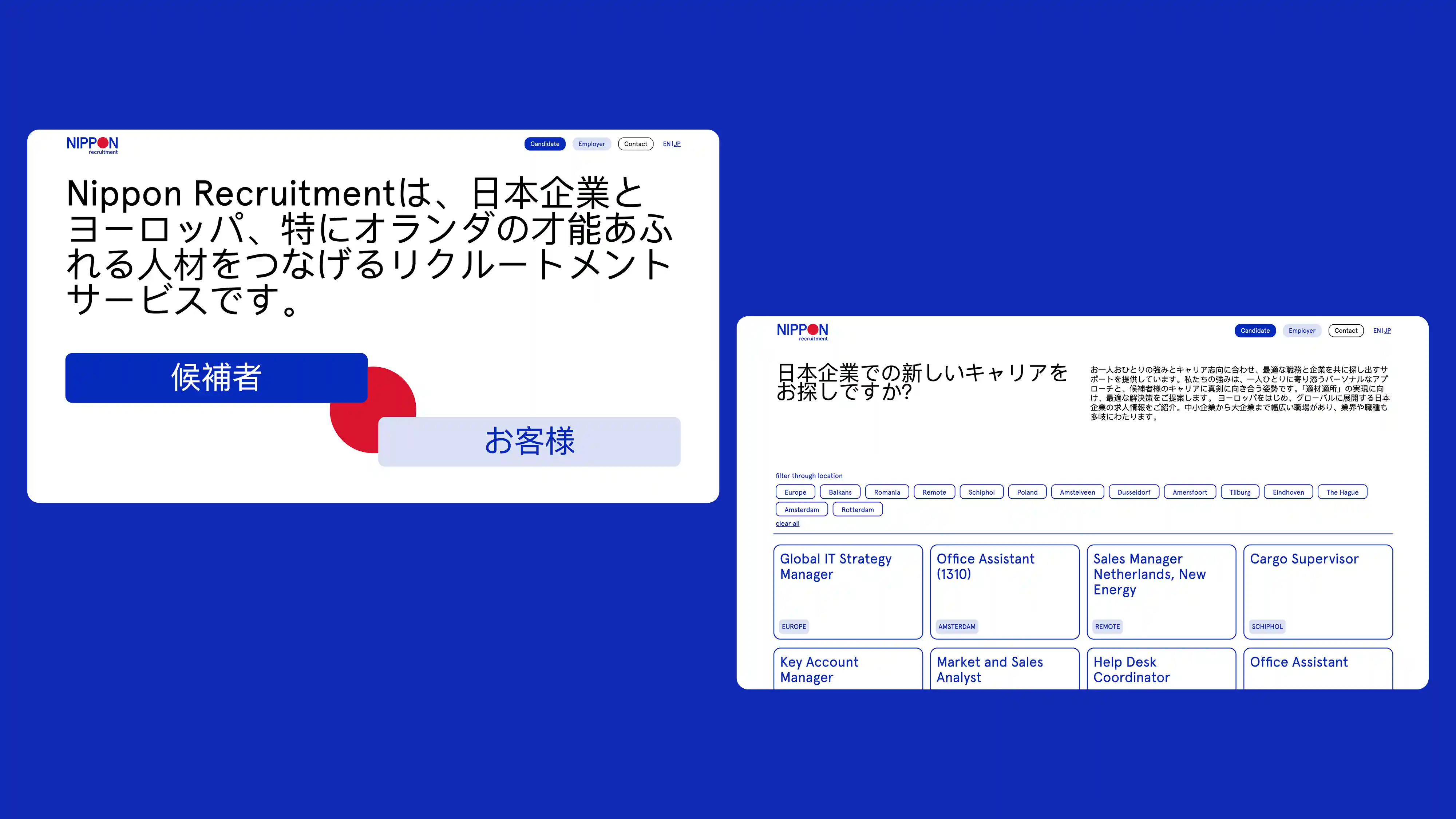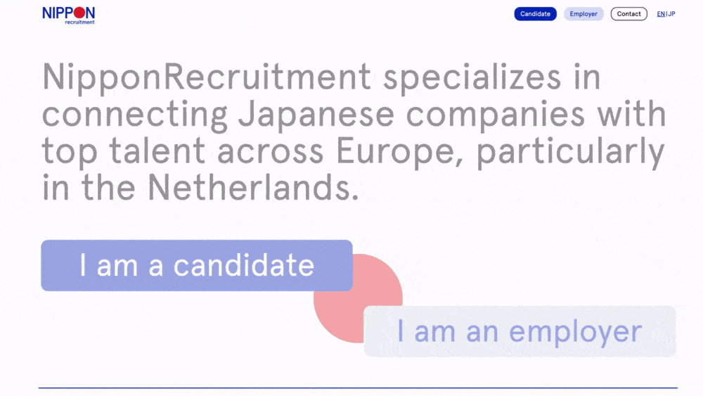 Nippon Recruitment connects Japanese companies with top European talent, focusing on the Netherlands. We redesigned their brand identity and website, which is their primary recruitment channel. The new site features a clear, user-friendly structure mainly tailored to recruiters and job seekers. A built-in filter system helps users search by location and apply directly through the jobs openings pages. The website design is clean and distinctive, bringing a sense of friendliness and freshness while maintaining professionalism.