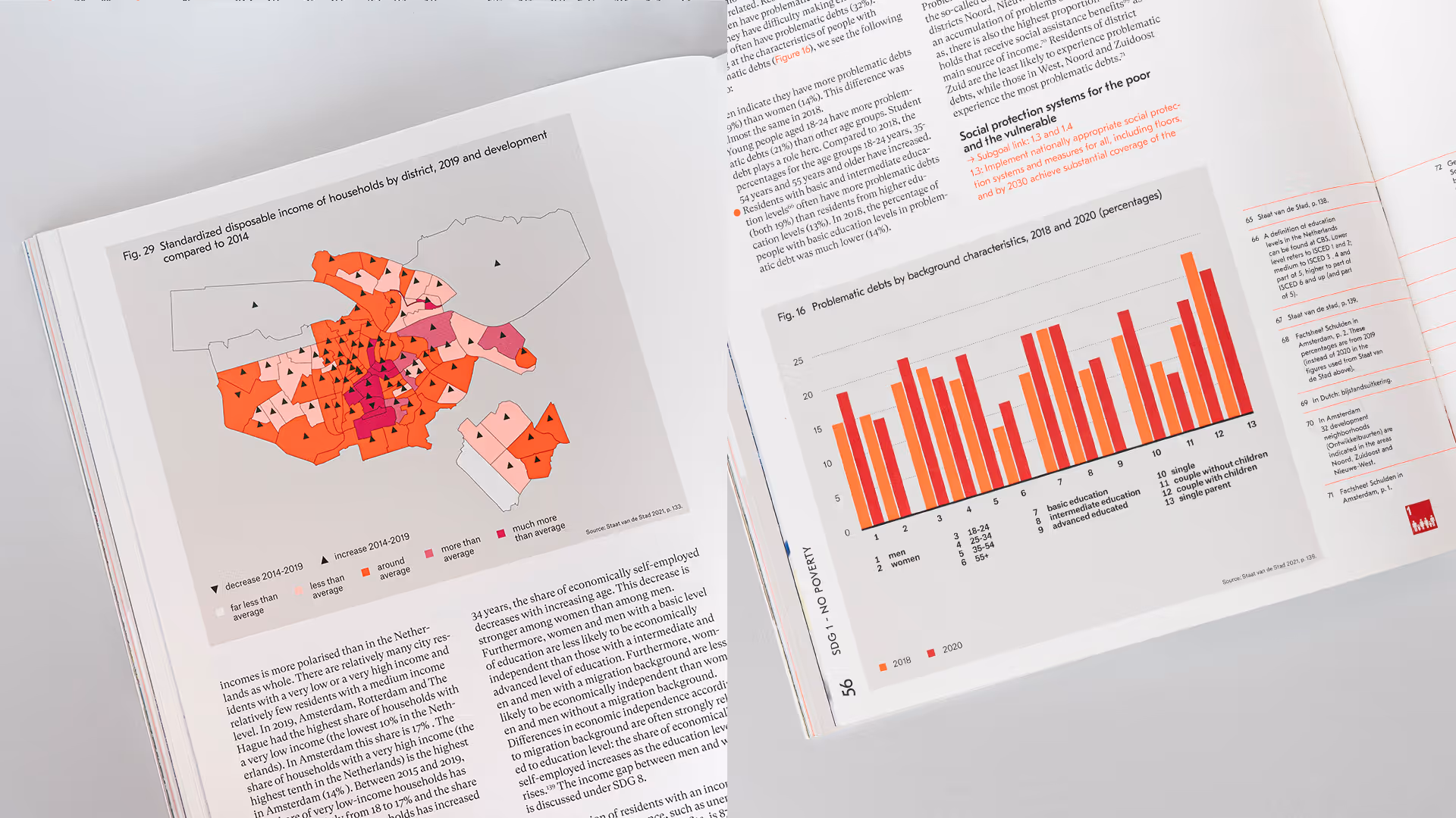 The book features a great number of data visualisation graphics alongside text providing a comprehensive assessment of Amsterdam’s performance on the Social Development Goals (SDGs).