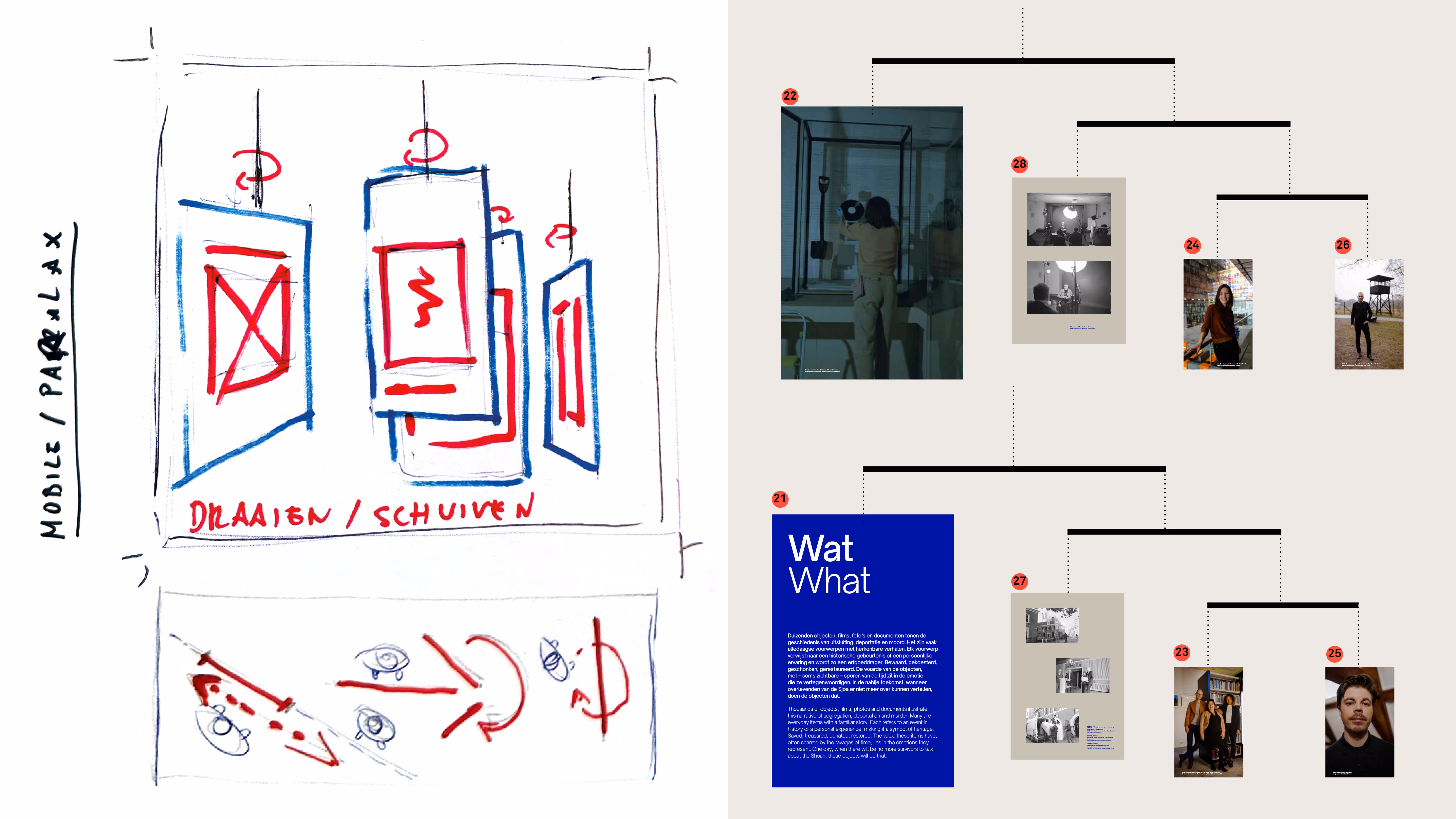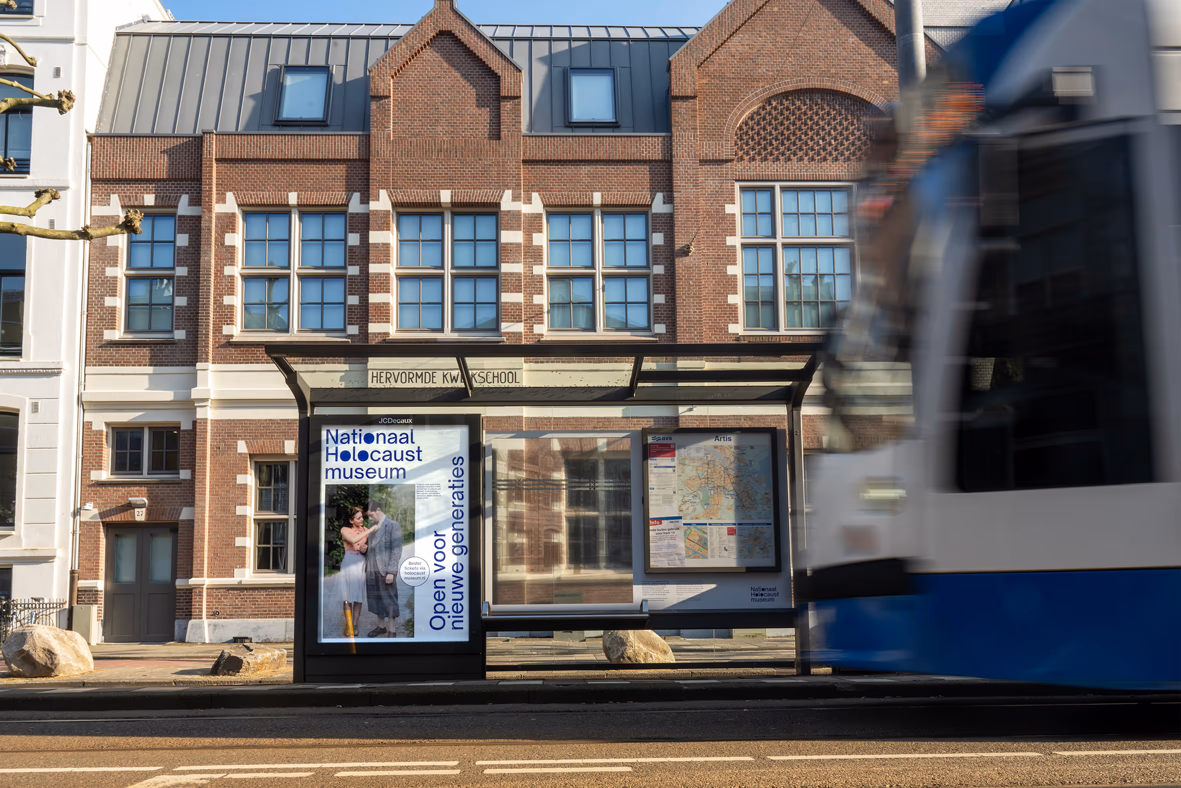 The National Holocaust Museum honors Jewish victims of the Holocaust and serves as a powerful reminder of Dutch Jewish history. Achter de Schermen/Behind the Scenes is a temporary photography exhibition we designed, documenting the museum’s creation and the people behind it, which opened in 2024. The permanent exhibition features personal portraits that inspired the opening campaign, with each poster telling a short story about an individual and their fate, while moving posters colorize black-and-white images to bring their stories to life.