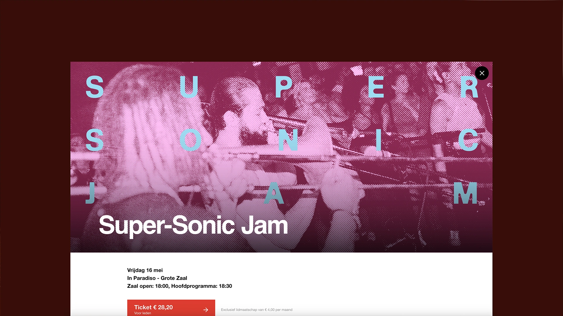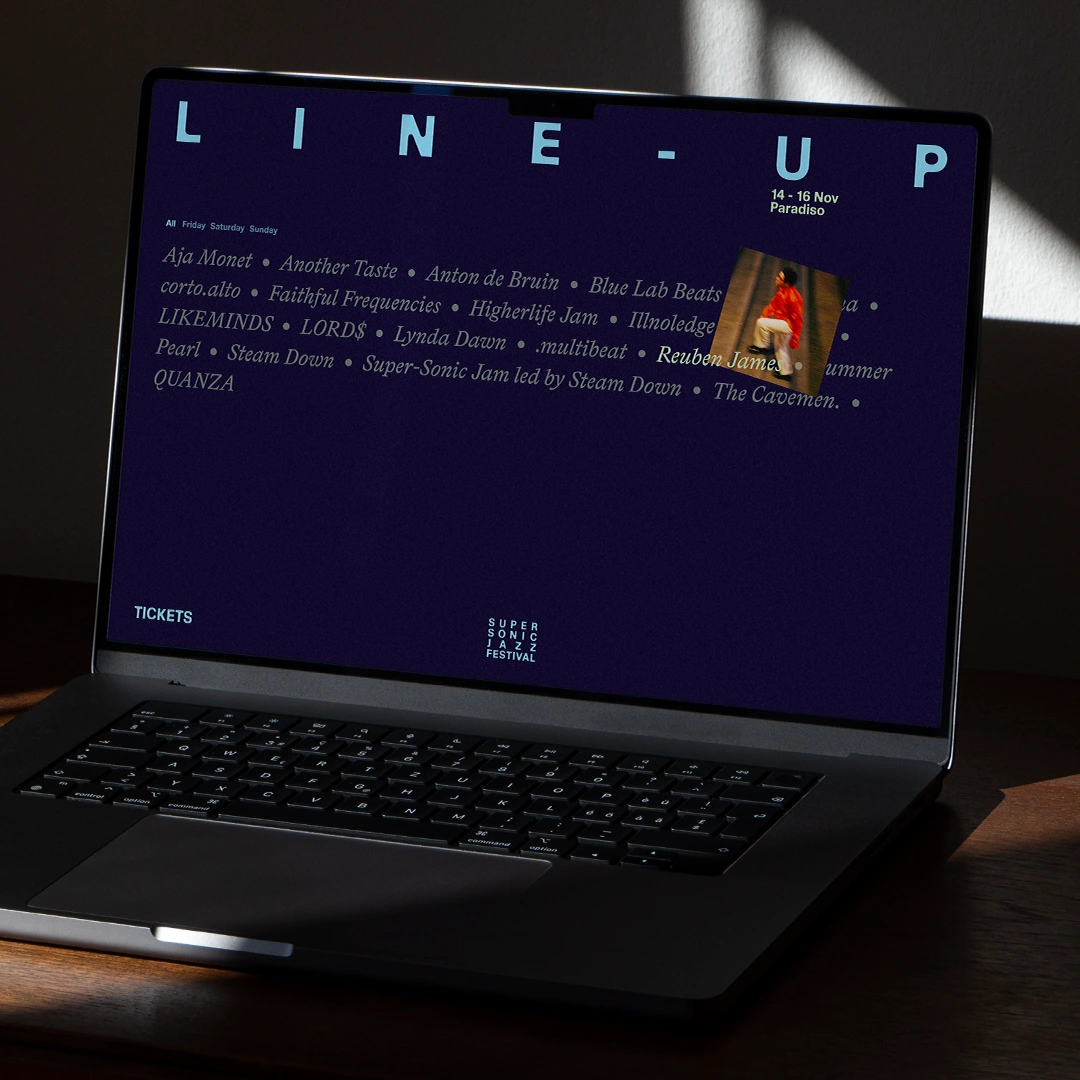 Super-Sonic Jazz at Paradiso features R&B, Future Jazz, Neo Soul and beyond. At once a monthly event, festival, label, and community, its identity is built on the concept of making space, stepping back to spotlight emerging talent. The identity we designed embraces the vintage and the analogue. Keeping things human with lo-fi animation and a bespoke hand lettered font.