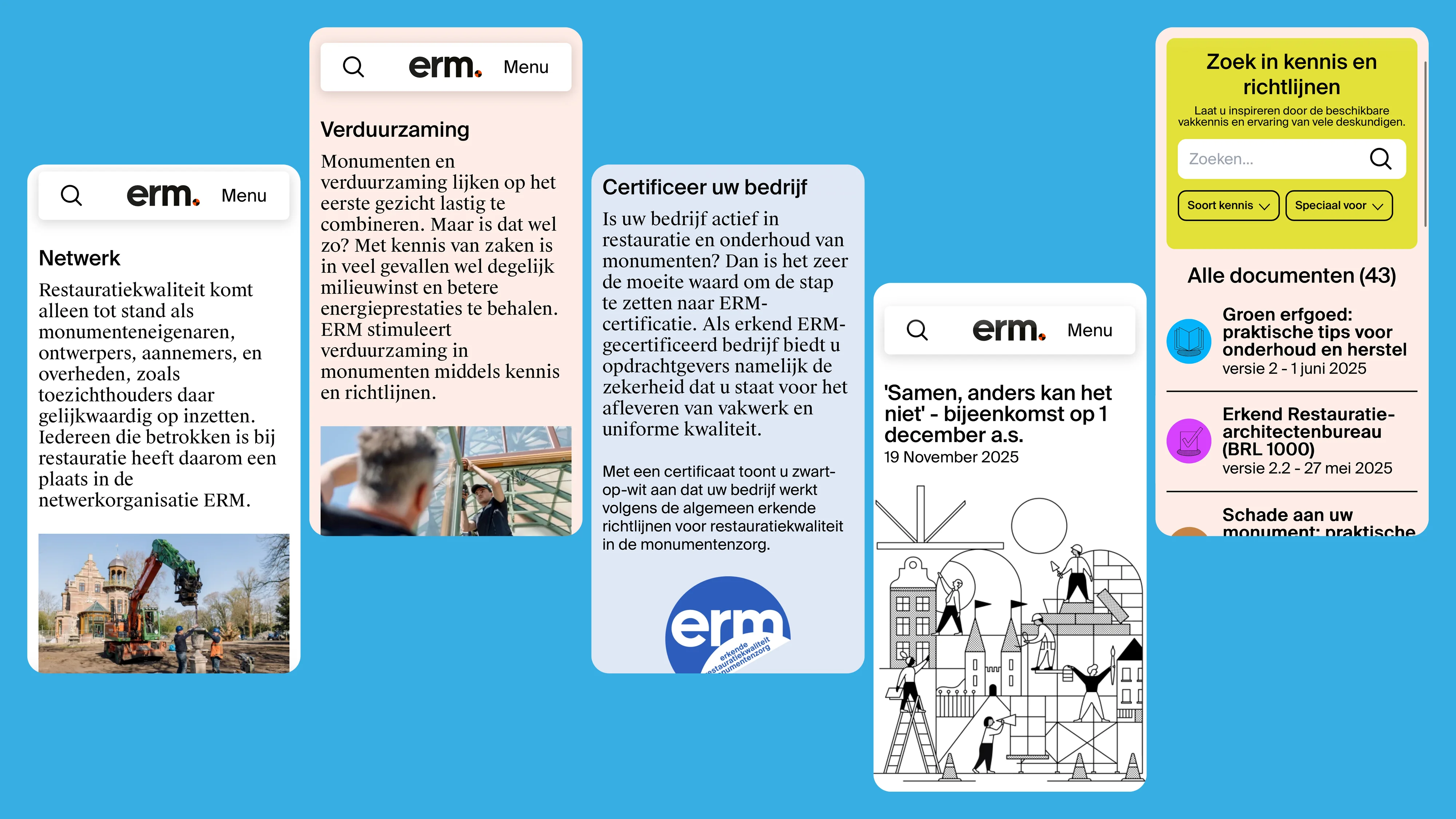 The ERM foundation ensures restoration quality in monument conservation and its website plays a key role in providing information to professionals, governments, monument owners and the general public. We rebranded their identity and reorganised their online presence from multiple websites into a single platform. The site’s core feature is its search function, always easy to reach on the landing page and in the fixed top menu bar. We developed two distinct search tools: one for news, events, and general documents, and another specifically for professionals seeking technical documentation. We also redesigned all technical documents to ensure a consistent and professional look throughout.